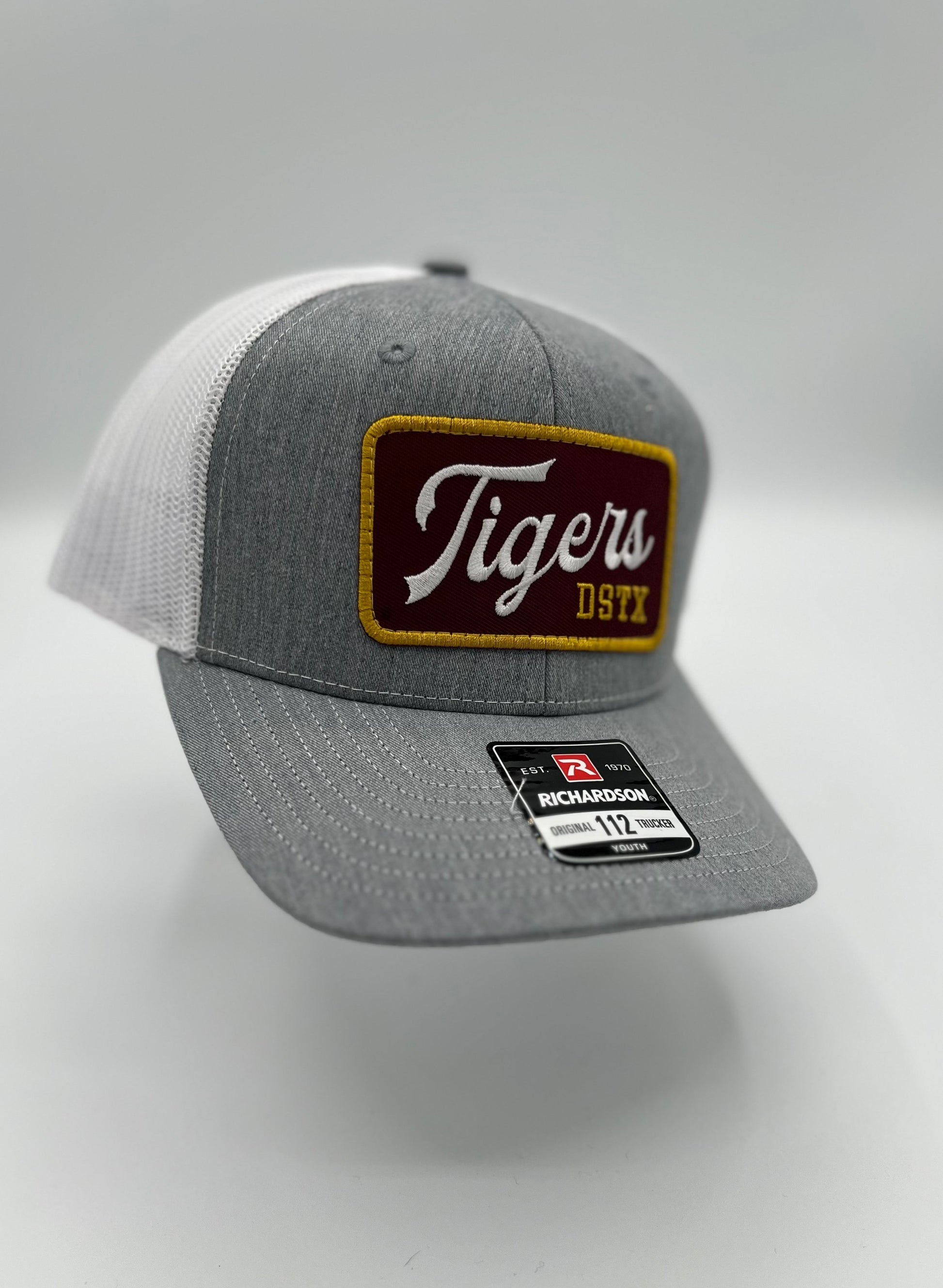 Heather gray front and white back with our staple, script Tigers DSTX patch.
