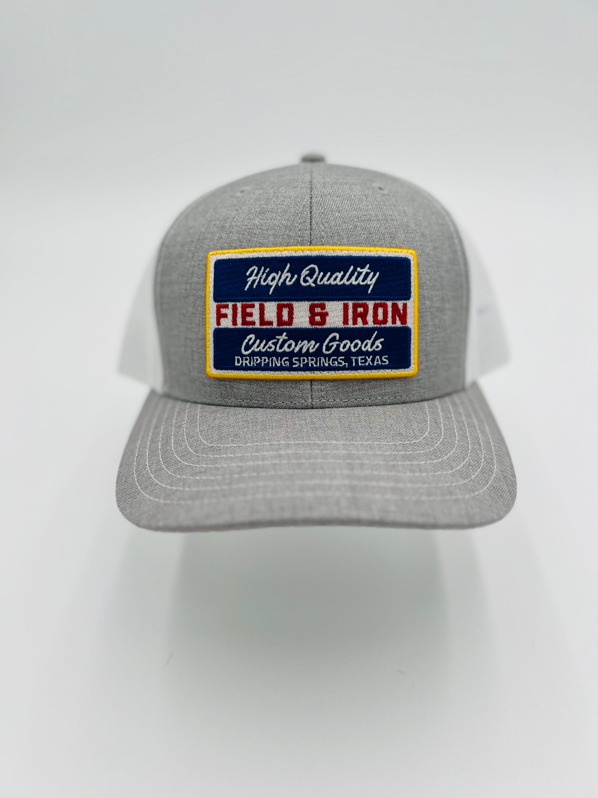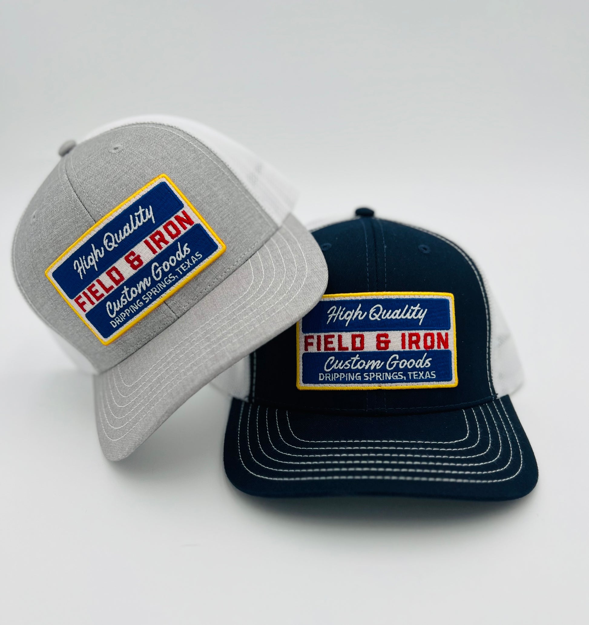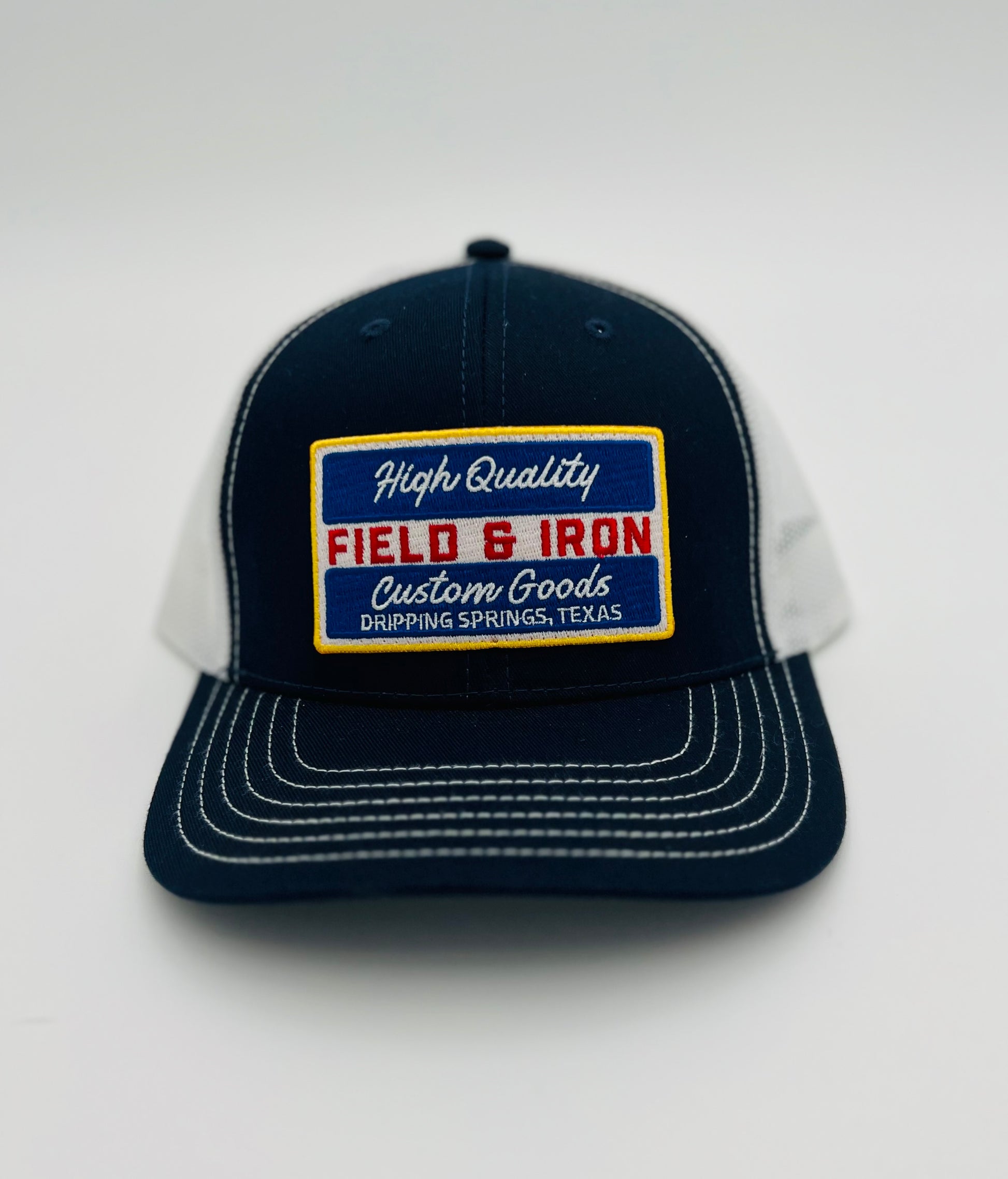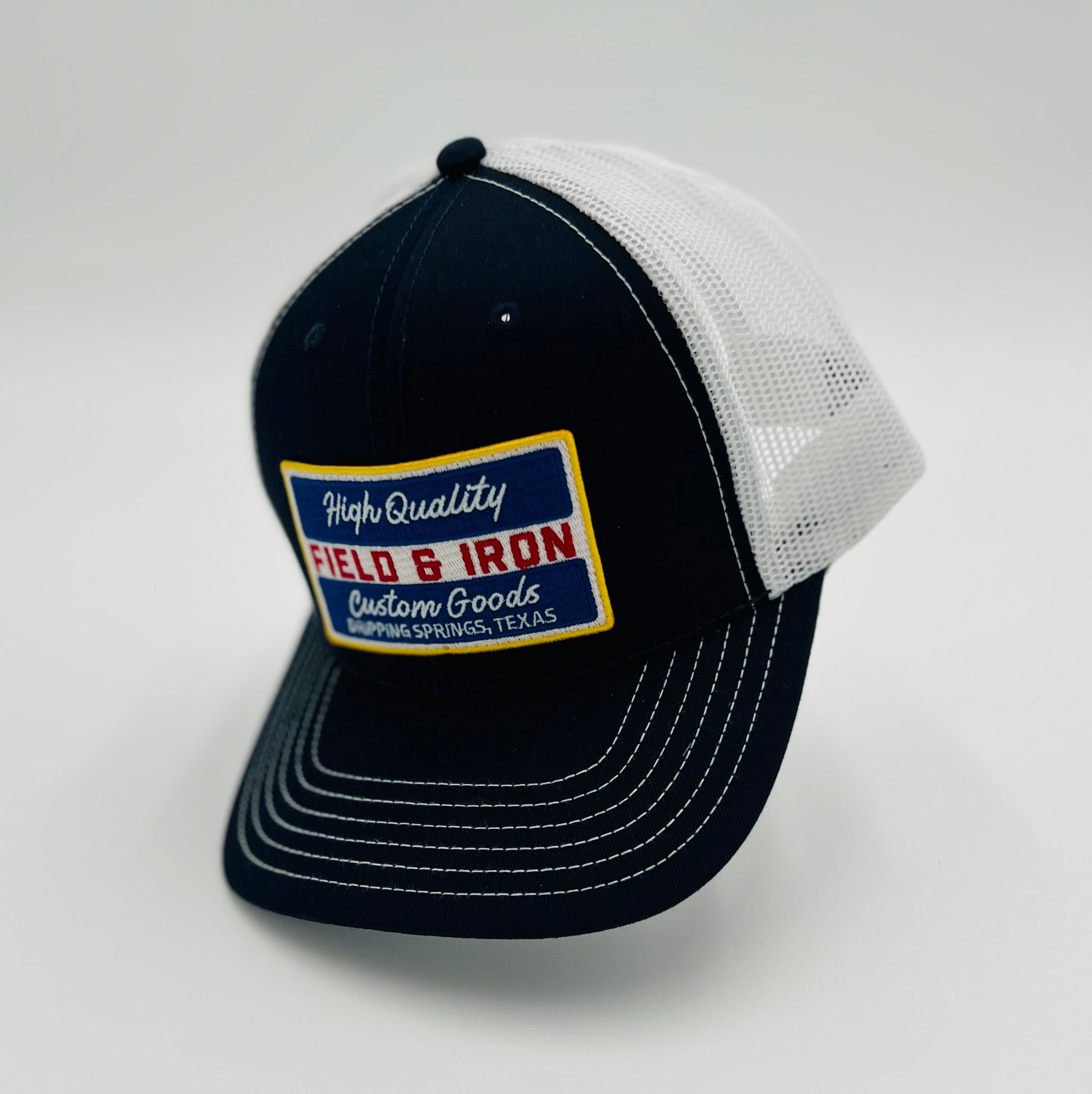 Navy or Silver front, white back mesh. Field & Iron "High Quality Custom Goods" patch.
