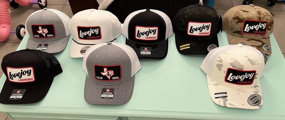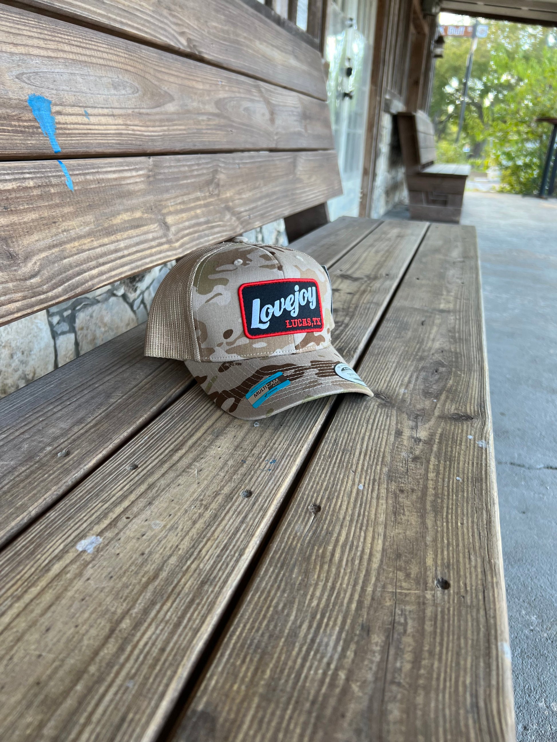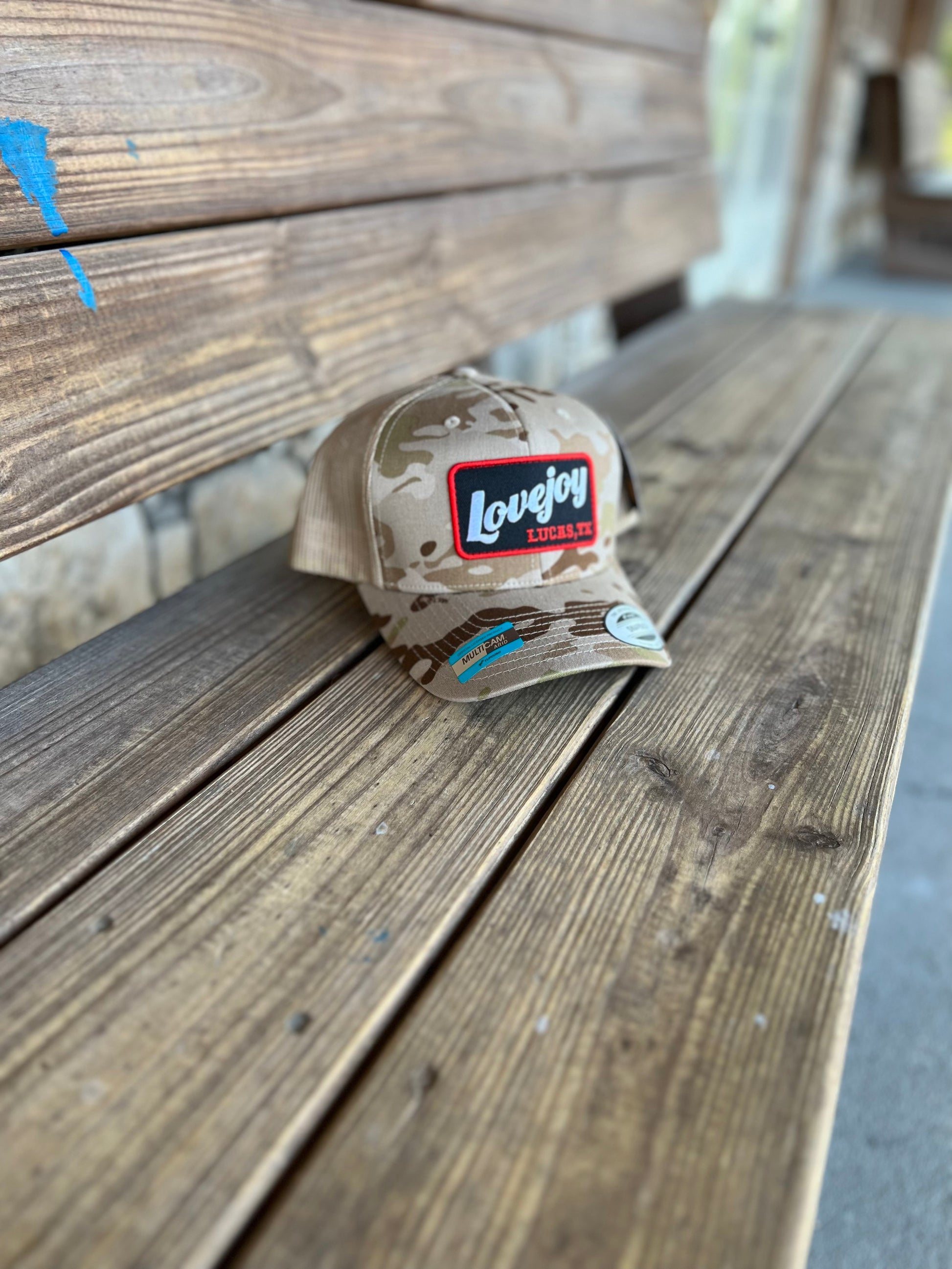 Love this camo pattern - especially next to Leopard red and black. A Yupoong 6606 Multicam hat, this one is fantastic. Looks great in any situation, and yea - folks will see you with that Lucas, Texas embroidered patch. Get some!